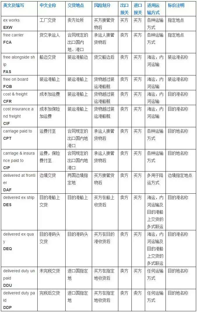 《2000年國(guó)際貿(mào)易術(shù)語(yǔ)解釋通則》(Incoterms 2000)列出十三種,比較如下: