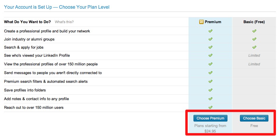在你注冊完賬戶之后,你會發(fā)現(xiàn)Linkedin有兩種會員模式,一種是付費的一種是免費的,其中最大的區(qū)別也是最有用的區(qū)別就是付費的版本你可以發(fā)信息給不在你好友圈子里的用戶,當(dāng)你熟悉了怎么使用Linkedin之后,可以根據(jù)自己的實際情況來看是否要加入付費會員。