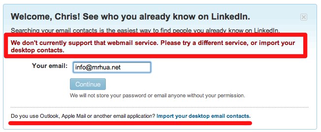 接下來一步很重要的事情,對于做外貿(mào)的人來說,你必須同步你平時和客戶溝通的郵箱,Linkedin會自動檢查所有和你交流過的人是否有注冊過Linkedin,如果你已經(jīng)做外貿(mào)很多年了,必然有很多有用的聯(lián)系人,借這個機會把他們都加入關(guān)系網(wǎng),一定會給你增加更多的機會。導(dǎo)入郵件的時候需要注意如果你用的不是常見郵箱如Gmail, MSN, AOL等,則需要通過導(dǎo)入文件的方式才可以進行。