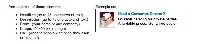 從Linkedin廣告投放的人群選擇性來看,的確是更為精準(zhǔn),廣告商可以選擇投放到特定的職位,行業(yè),地理位置,性別,公司以及Linkedin組群,也可以自由的組合各種屬性。Linkedin廣告的編輯其實和Adwords大同小異,唯一多了一個小圖片: