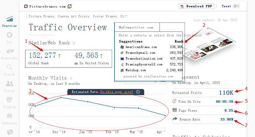 如何選擇關(guān)鍵詞? 在這里我建議沒必要太過糾結(jié),確定你的主關(guān)鍵詞,這與你的商業(yè)定位有關(guān),通過keywords planner 采集好到一個表格中,細(xì)分,篩選。下面我們使用一個工具 similarweb.com archive.org(需翻墻使用)來分析我的競爭對手 pictureframes.com(其實他并不是,只是和我做同一個種產(chǎn)品,不過他做的是B2C)