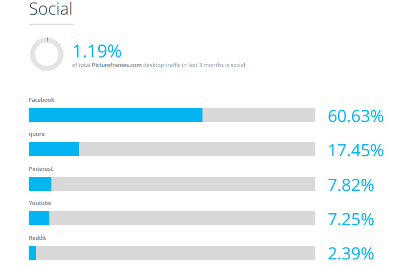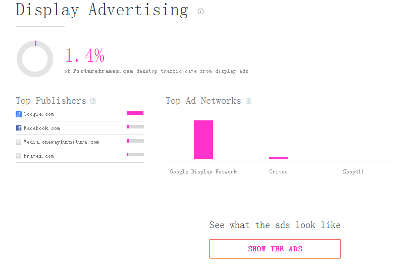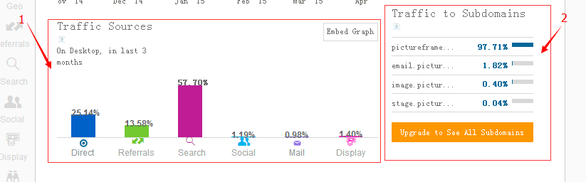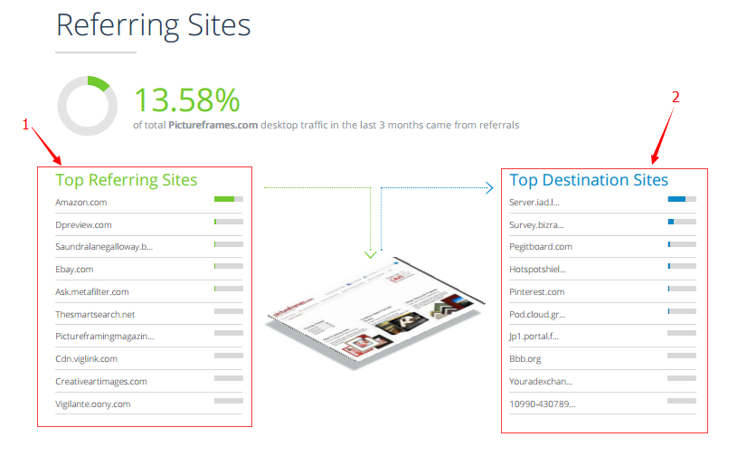 1. 表示3個月內(nèi)引薦流量來源前10的網(wǎng)站,數(shù)據(jù)表示,網(wǎng)站總流量的13.58% 的主要來源是 amazon.com,寫到這里才發(fā)現(xiàn),我選擇pictureframes.com 作為案例講解就是個錯誤了,因為我并不擅長B2C,也不知道如何通過amazon來引流;