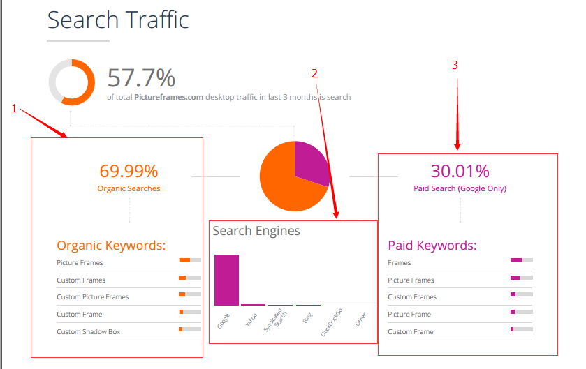 - Search(搜索流量):一般通過搜索引擎進(jìn)入自身網(wǎng)站的流量,57.7%的總流量比例證明網(wǎng)站在搜索引擎的投入(外鏈建設(shè),以及ppc的投入)相當(dāng)大。具體在后面的數(shù)據(jù)中體現(xiàn)。