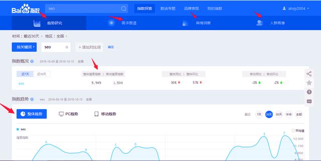 在做一些關(guān)鍵詞分析的時候我們會經(jīng)常用到百度指數(shù)來分析,另外從百度指數(shù)分析還可以了解PC端和移動端對同一個關(guān)鍵詞不同的搜索趨勢,便于我們針對不同的關(guān)鍵詞對不同的設(shè)備進行優(yōu)化。還有一個作用就是可以利用百度指數(shù)來挖掘長尾關(guān)鍵詞。總之百度指數(shù)對掛見此分析提供重要的參考依據(jù)。