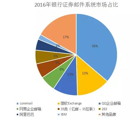 相比政府機(jī)構(gòu),銀行證券機(jī)構(gòu)在國(guó)產(chǎn)化和去IOE過程中相對(duì)較慢,因此微軟和IBM等國(guó)外品牌依然占有一定比例,更傾向于選擇有實(shí)力的品牌。Coremail、微軟、騰訊、網(wǎng)易這些實(shí)力雄厚的品牌占去半壁江山,占比65%。