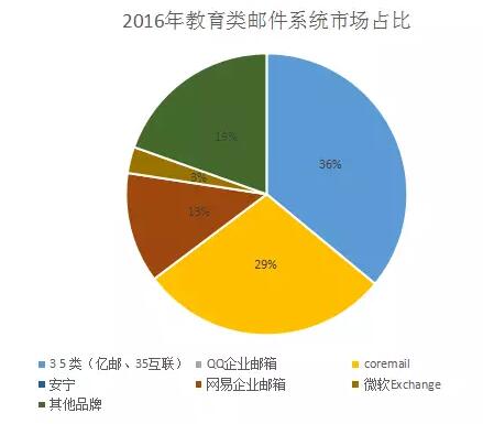 35類中的億郵是國(guó)內(nèi)較早進(jìn)入教育行業(yè)的郵件系統(tǒng),在中小院校中具有比較大的影響力。QQ企業(yè)郵箱因?yàn)殒溄観Q、微信,所以影響力也慢慢強(qiáng)大起來。Coremail郵件系統(tǒng)主要在985、211類高校具有比較大的占比,在百?gòu)?qiáng)高校中占去6成的份額。35類、QQ企業(yè)郵箱和Coremail郵件系統(tǒng)三大品牌占去了教育機(jī)構(gòu)7成市場(chǎng)。