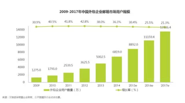 根據(jù)艾瑞相關(guān)報(bào)告分析及預(yù)測(cè):2014年,中國(guó)企業(yè)郵箱用戶規(guī)模僅為6000萬左右,但到2016年底,中國(guó)企業(yè)郵箱用戶規(guī)模將達(dá)到1.12億,并且仍將持續(xù)高速增長(zhǎng),至2017年底,將有望達(dá)到1.35億??梢?,在企業(yè)辦公應(yīng)用中,電子郵件仍然發(fā)揮著不可替代的作用,并且其重要性正在逐年提高。