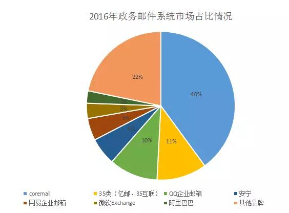 從上圖可見,政府機(jī)構(gòu)絕大部分采用國(guó)內(nèi)郵件系統(tǒng),微軟Exchange只占3%。已知品牌中,Coremail郵件系統(tǒng)以40%領(lǐng)先,35類郵件系統(tǒng)包括億郵、35互聯(lián)兩個(gè)產(chǎn)品,以11%緊跟其后。騰訊企業(yè)郵箱、網(wǎng)易企業(yè)郵箱以及阿里巴巴三大巨頭憑借強(qiáng)大的品牌優(yōu)勢(shì),也占有一定比例。