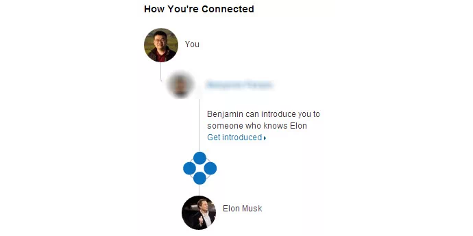 或者,如果你中意于特斯拉(Tesla)汽車的設(shè)計,而對創(chuàng)始人埃隆·馬斯克(Elon Musk)產(chǎn)生濃厚的興趣。說不定,你的朋友恰恰就認(rèn)識埃隆·馬斯克,而他就可以幫你和這個傳奇的公司創(chuàng)始人和CEO建立某種聯(lián)系。埃隆·馬斯克出生在南非,18歲移民到美國,是全球最大的網(wǎng)上支付公司PayPal,SpaceX(空間探索技術(shù)公司),特斯拉汽車,以及SolarCity四家公司的CEO。