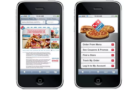 桌面端網(wǎng)頁在移動端設(shè)備上首要的障礙就是導(dǎo)航的使用??纯聪旅鍰omino批薩的案例,它的桌面端和移動端網(wǎng)頁的對比就相當(dāng)明顯,移動端頁面經(jīng)過優(yōu)化之后的體驗(yàn)就完全不同。簡單說來,優(yōu)化后的移動端頁面更加干凈,有著更容易導(dǎo)航的CTA按鈕。