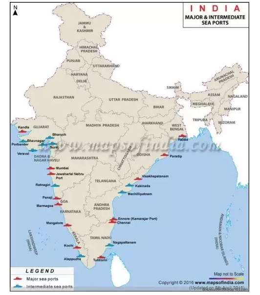 根據(jù)Map of India網(wǎng)站(www.mapsofindia.com)介紹,印度主要的港口有12個(gè),但以下歸成了11個(gè)。如圖所示,自西向東分別如下: