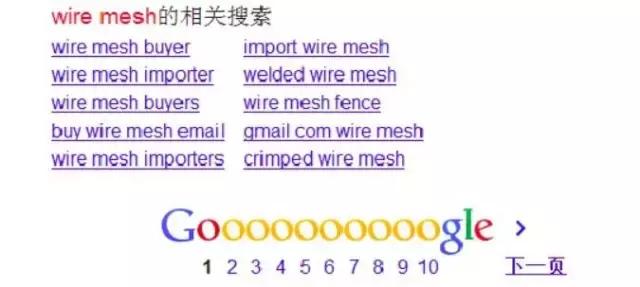 利用搜索引擎:利用搜索引擎的搜索功能,找到與頁(yè)面相關(guān)的關(guān)鍵字。比如:在 Google 搜索框中輸入 wire mesh,得到與 wire mesh 相關(guān)的關(guān)鍵字:wire mesh buyer、wire mesh importer、wire mesh buyers、buy wire mesh email、wire mesh importers、import wire mesh、welded wire mesh、wire mesh fence、gmail com wire mesh、crimped wire mesh。
